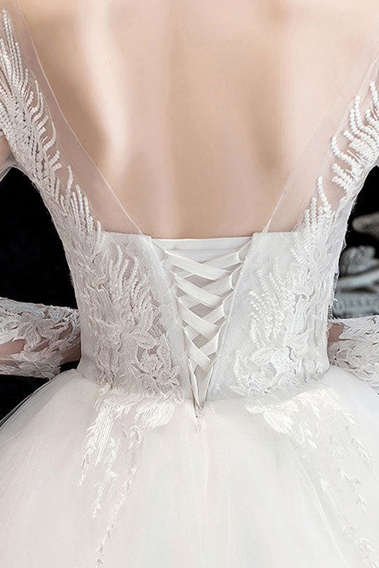 Latest White Wedding Dress Ball Gown Cathedral Train Jewel Neck 3/4 Length Sleeves Applique Satin Fabric Bridal Gowns