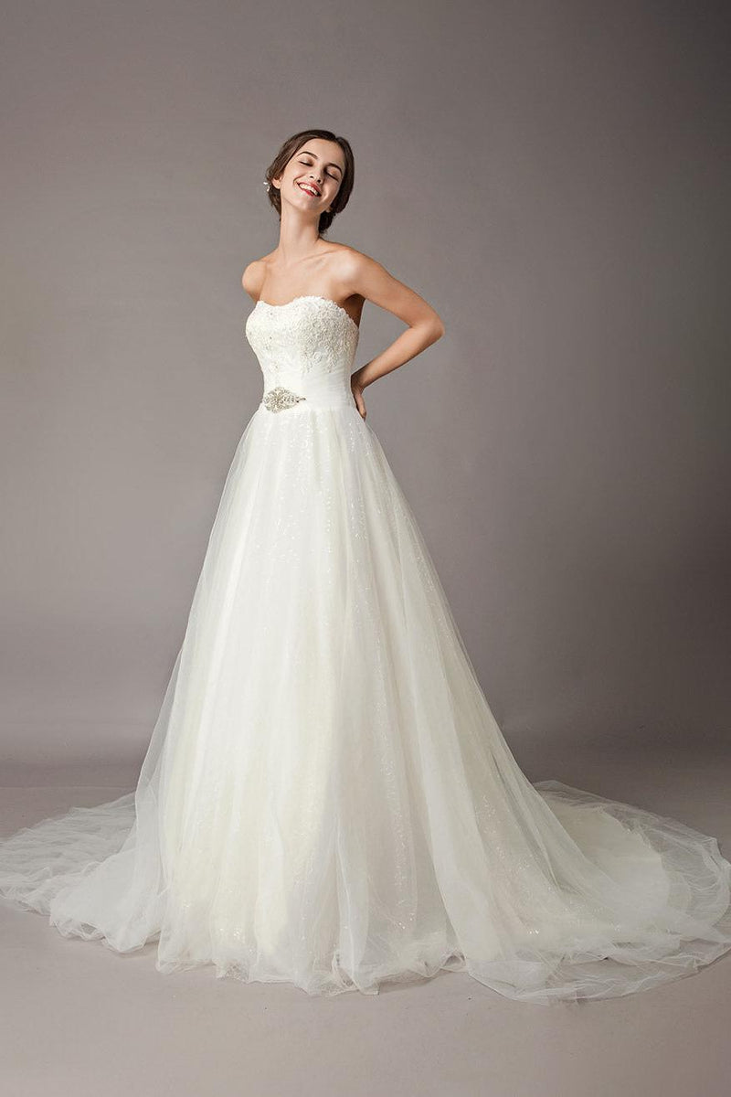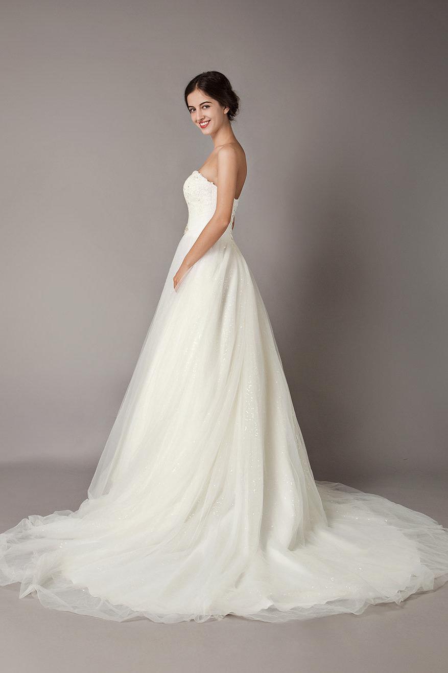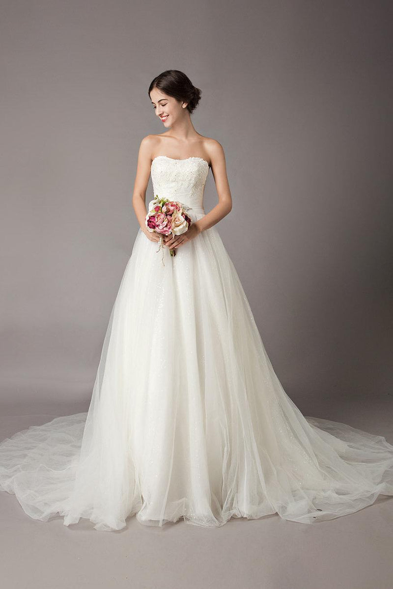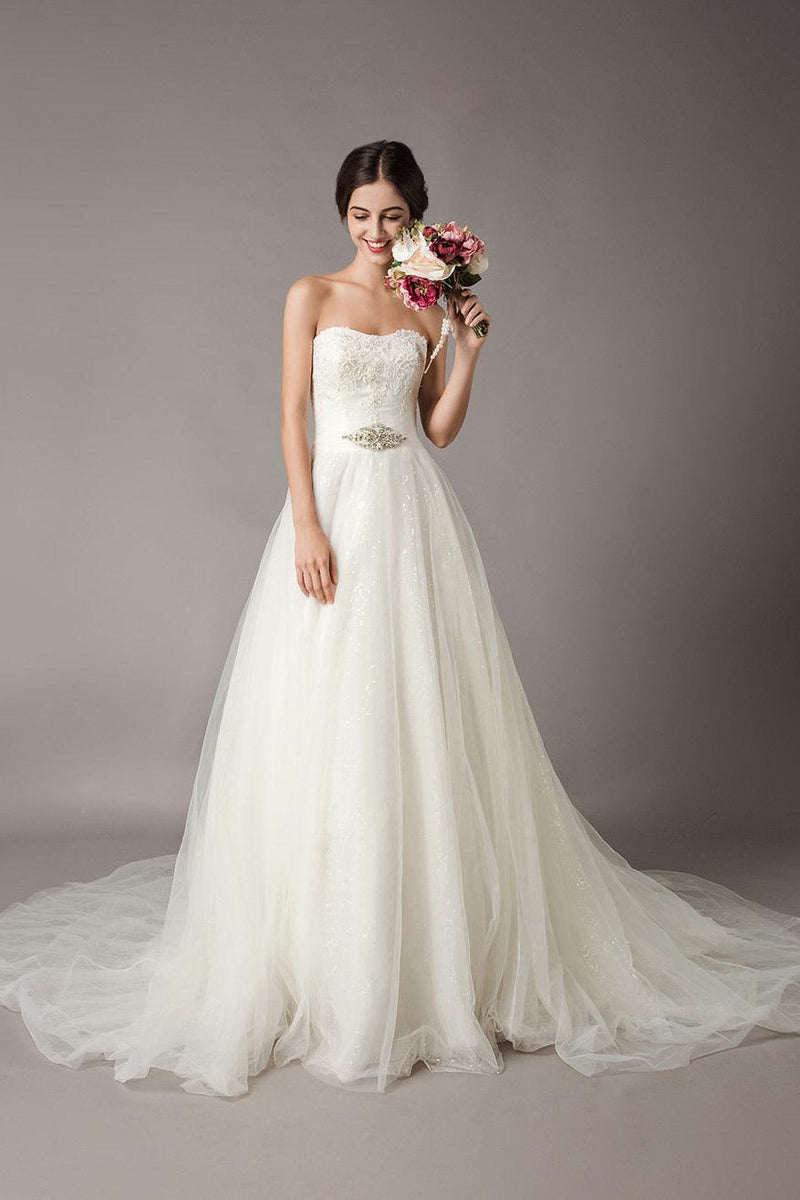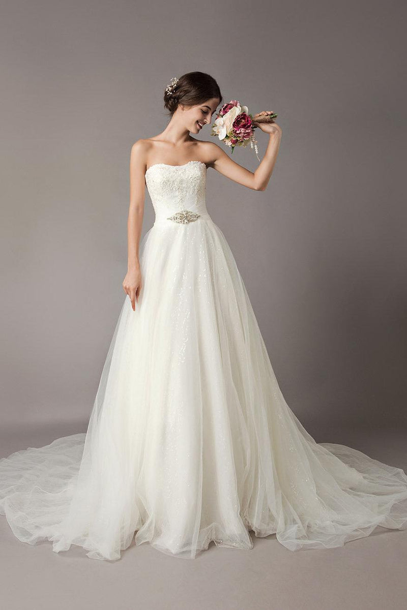 Wedding Dresses Ivory Strapless Lace Beaded Chapel Train Bridal Gowns