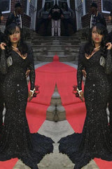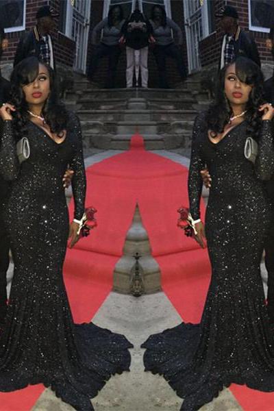 Charming Black Sequins Long Sleeves Deep-V-Neck Alluring Prom Dresses