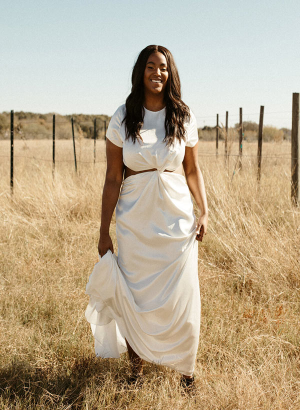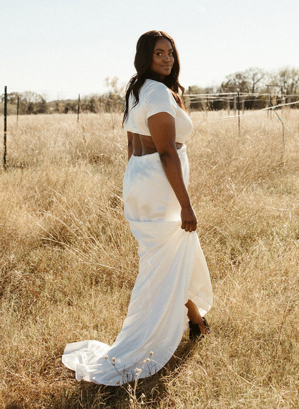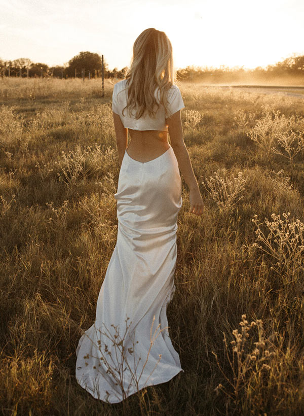 Scoop Neck Short Sleeves Sweep Train Elastic Satin Wedding Dresses Bows