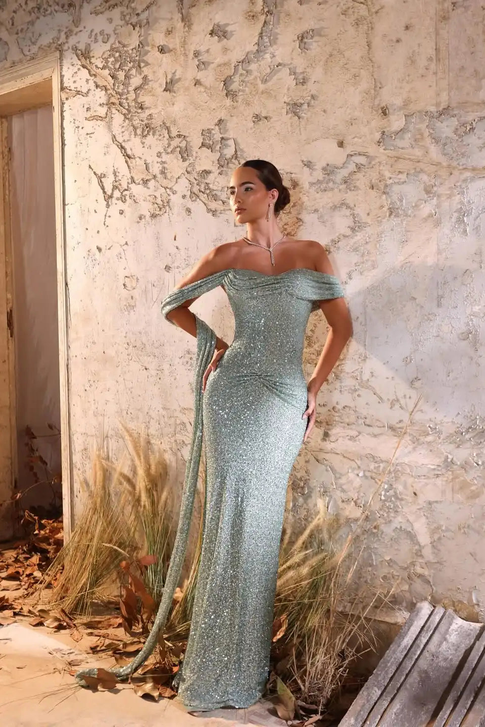 Captivate the room in this enchanting green prom dress, designed with a romantic sweetheart neckline and striking one-shoulder silhouette. Adorned with shimmering sequins that catch the light with every movement, this mermaid sheath gown features elegant ruffle detailing that adds dimension and grace. The fitted bodice flows into a dramatic fishtail hem, creating a stunning silhouette that flatters and commands attention. Perfect for prom night or any formal occasion where you want to make an unforgettable impression.