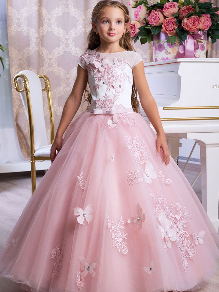Bateau Neck Sleeveless Ankle Length Bows Sash Butterfly Kids Party Dresses