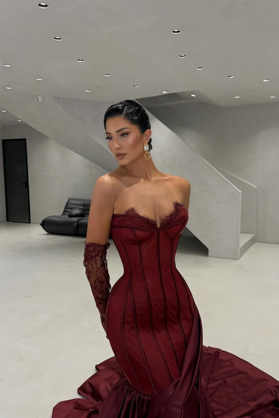 Make a stunning entrance in this sparkling burgundy prom dress, designed to captivate. The sweetheart neckline and strapless cut create an elegant silhouette, while luxurious satin fabric drapes beautifully. The mermaid sheath style hugs your curves before flowing gracefully to the floor, accentuating your natural beauty. Included satin gloves add a touch of timeless glamour and refinement. Perfect for prom, formal galas, or any special occasion where you want to shine with confidence and sophistication.