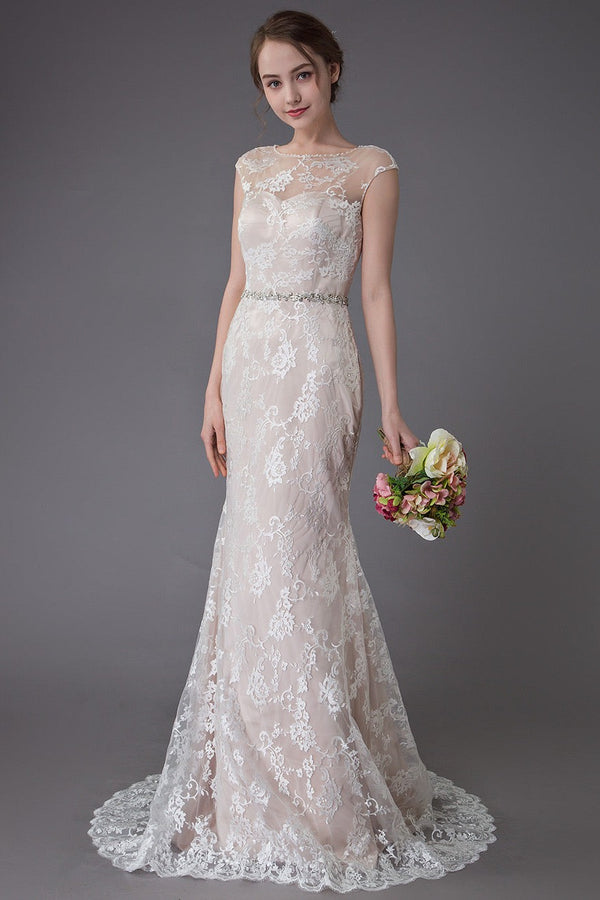High Qulity Lace Mermaid Wedding Dress Illusion Chaple Train Ivory Beading Bridal Gown