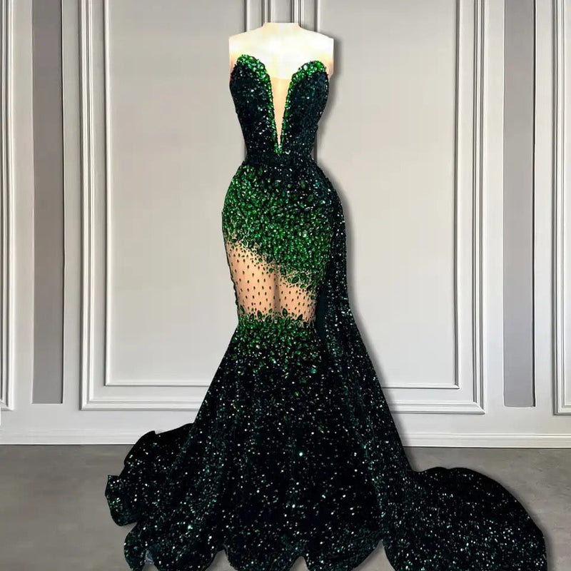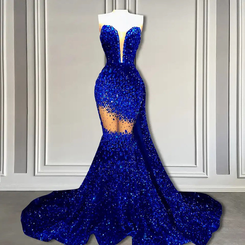 V-Neck Sequins Prom Dress Mermaid Sleeveless Crystal.