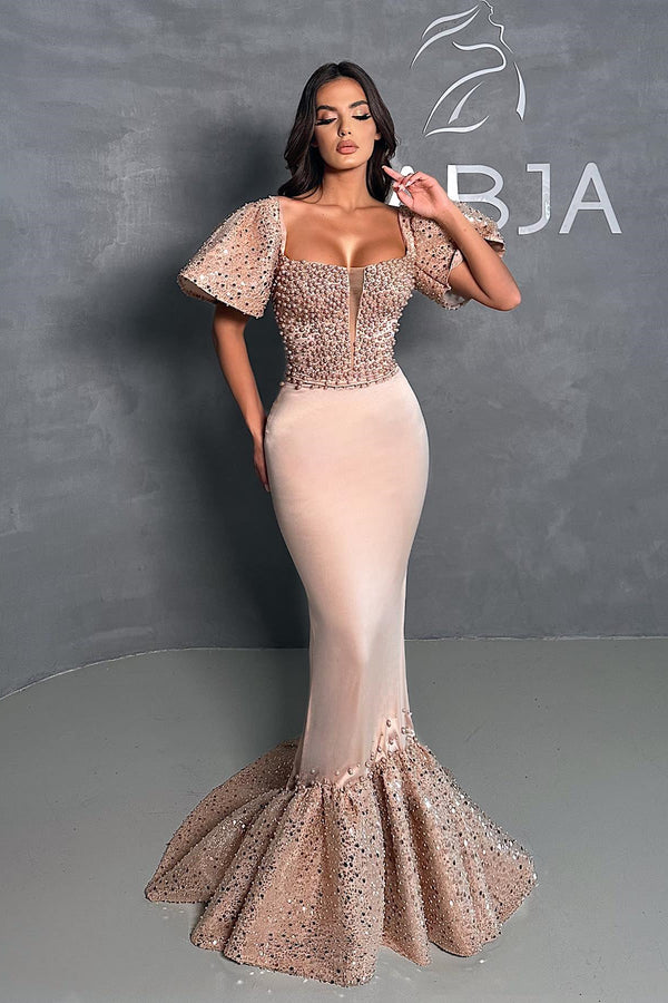 Glowing Champagne Square Mermaid Straps Prom Dresses Sequins Sleeveless With Beads