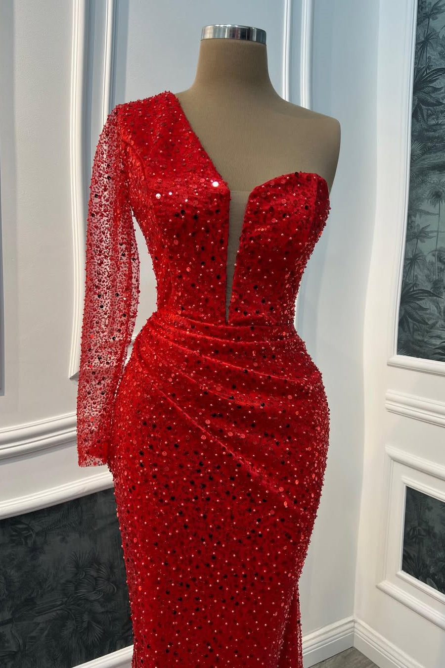 Make a stunning entrance in this timeless red prom dress, designed with an elegant one-shoulder neckline and flowing long sleeves. Adorned with shimmering sequins throughout, this mermaid silhouette hugs your curves beautifully before gracefully sweeping to the floor. The sophisticated draping and luxurious embellishments create an unforgettable look perfect for prom night or any formal occasion. Available online for convenient shopping.