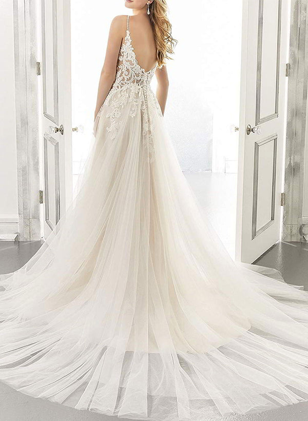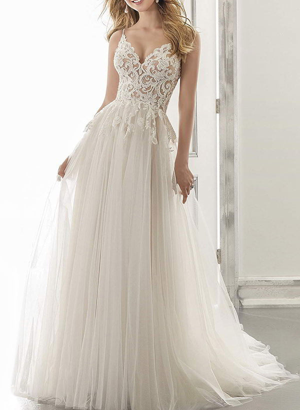 Boho Garden Chic A-line Elegant Sweetheart Sleeveless Tulle Wedding Dresses Appliques Lace