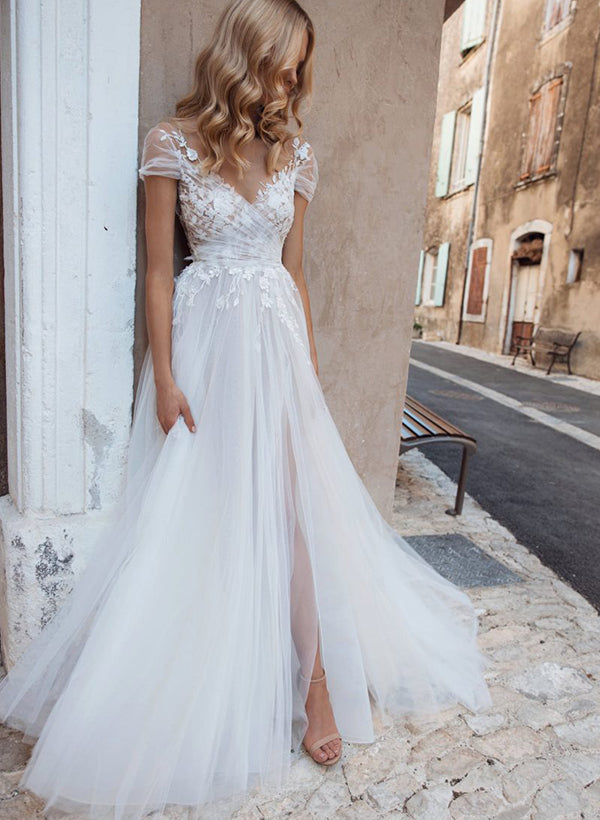 Boho Garden Chic A-line V-Neck Short Sleeves Lace Tulle Wedding Dresses Front Split