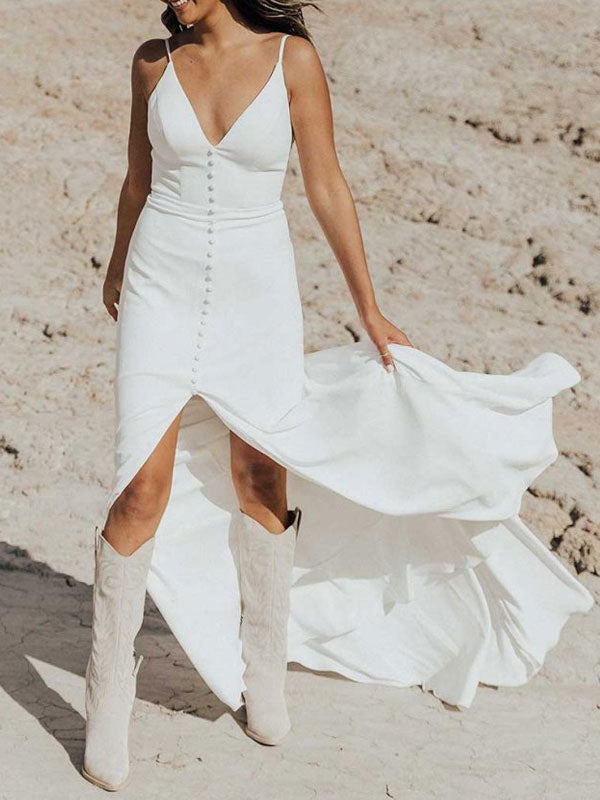 Elegant Wedding Dresses V Neck Sleeveless Backless Beaded Split Front Long Bridal Gown