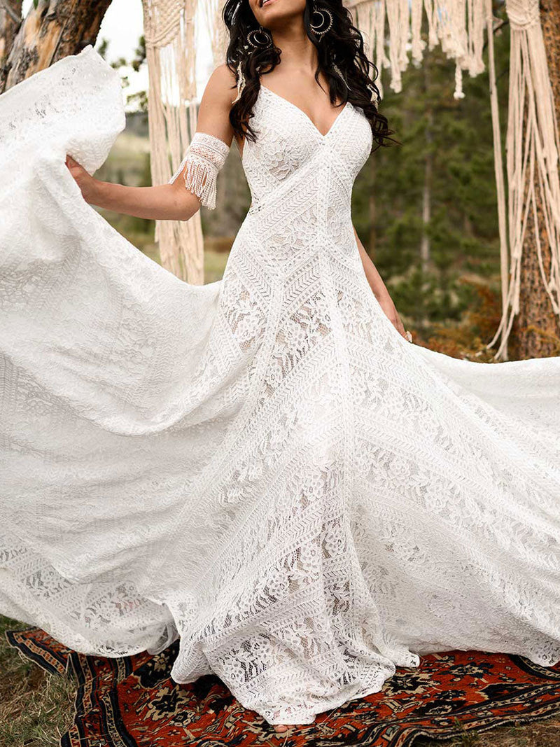 Elegant Wedding Dresses With Train V Neck Sleeveless Lace A Line Long Bridal Gown