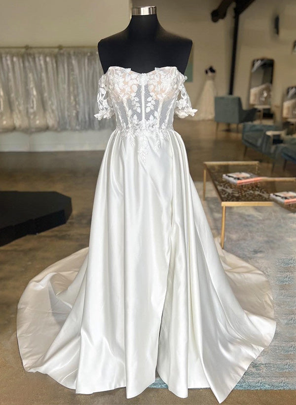Off-The-Shoulder Elegant Sweetheart Lace Satin Wedding Dresses Split Front