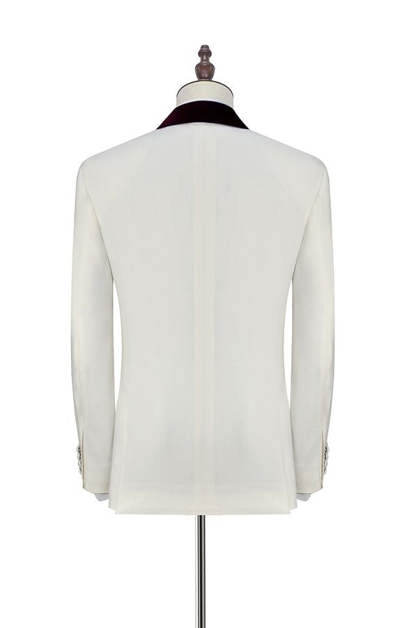 Velvet Shawl Collar White Wedding Tuxedos Three Piece Wedding Suits with Burgundy Vest