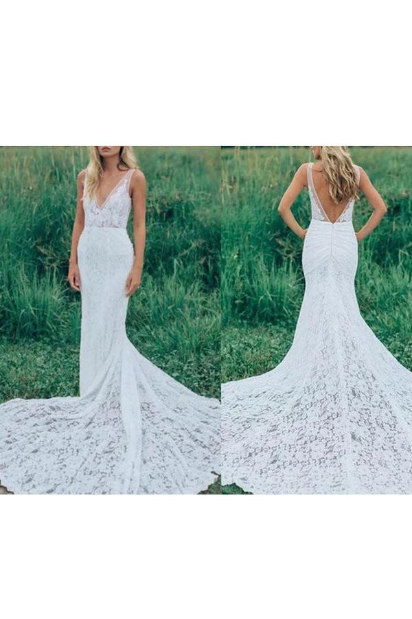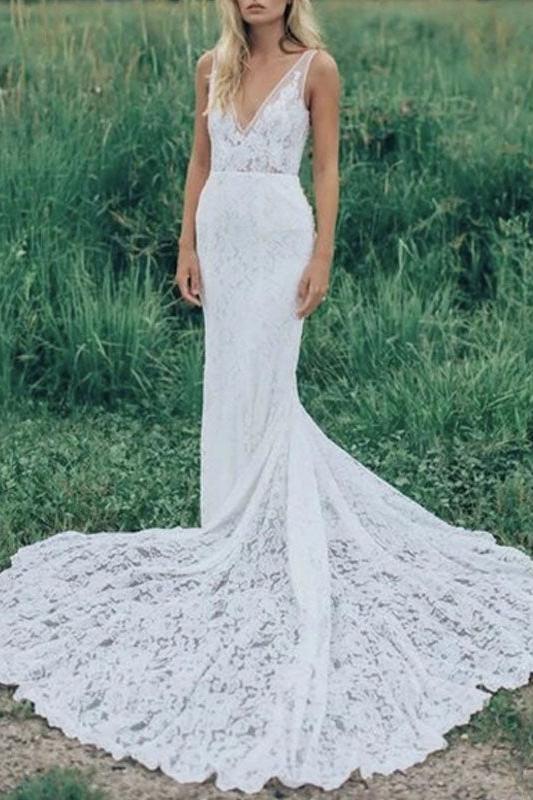 Boho Wedding Dresses Mermaid Chic V-Neck Sleeveless Lace Beach Bridal Dress With Train