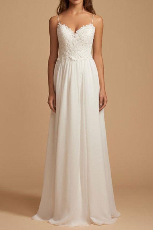 Casual Wedding Dress A-line Chic V-Neck Straps Sleeveless Lace Chiffon Bridal Gowns With Train For Beach Party