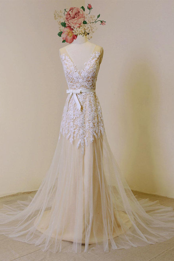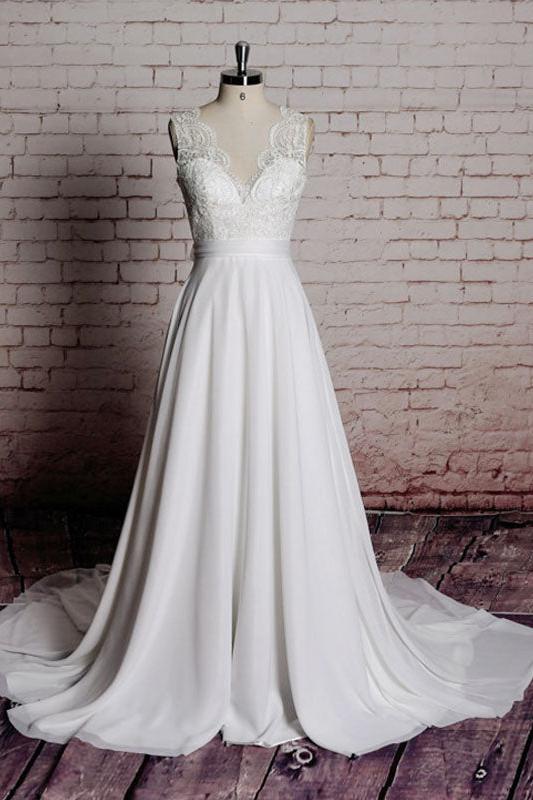 Casual Wedding Dress A-line Chic V-Neck Sleeveless Long Lace Bridal Gowns