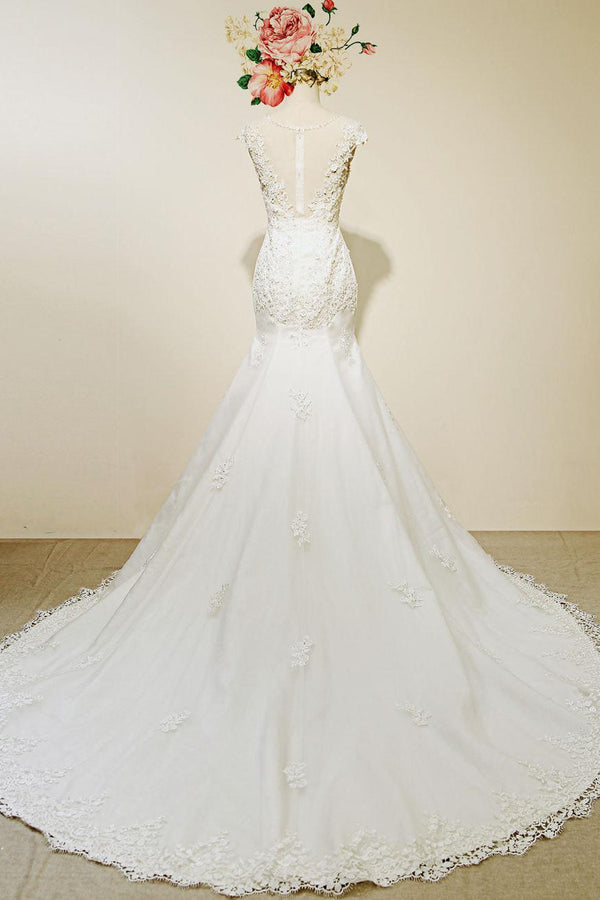 High Qulity Lace Mermaid Wedding Dress Illusion Chaple Train Ivory Beading Bridal Gown