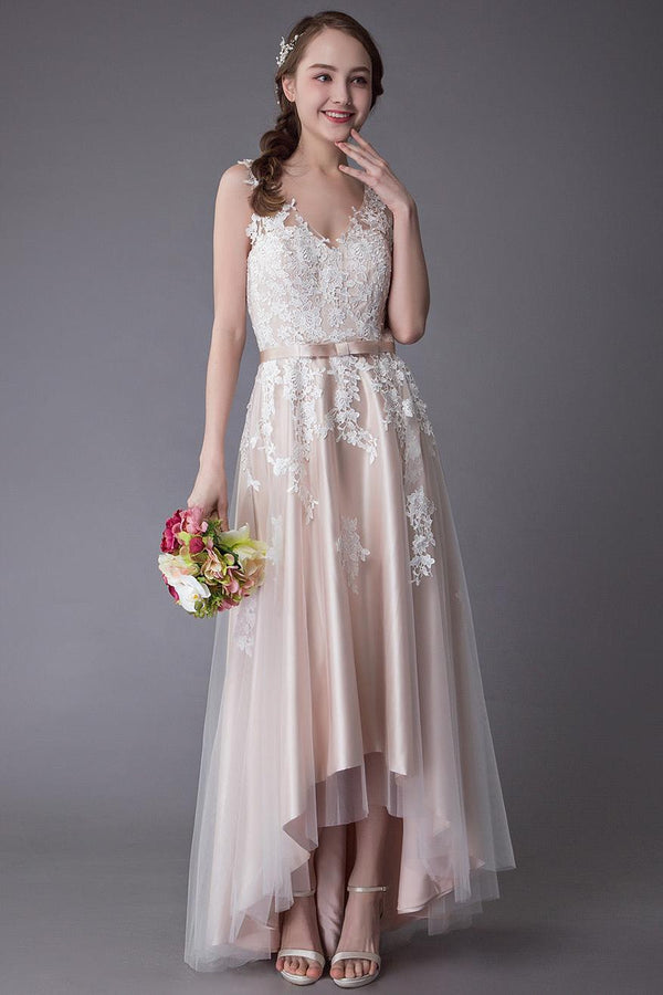 Lace Wedding Dresses High Low Bow Sash Tulle Applique Summer Beach Colored Bridal Gowns Exclusive