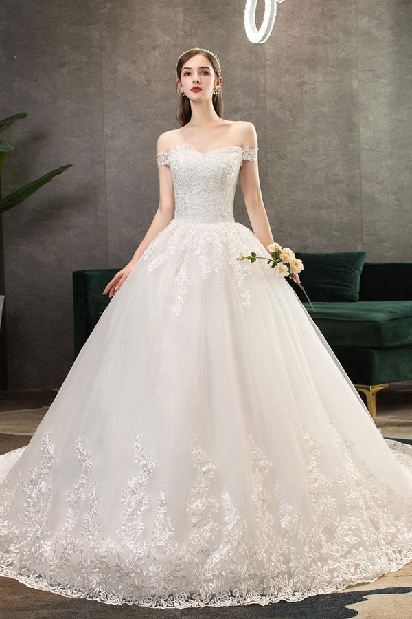 Lace Wedding Dresses Ivory Lace Applique Off The Shoulder Short Sleeve Princess Bridal Gown With Train