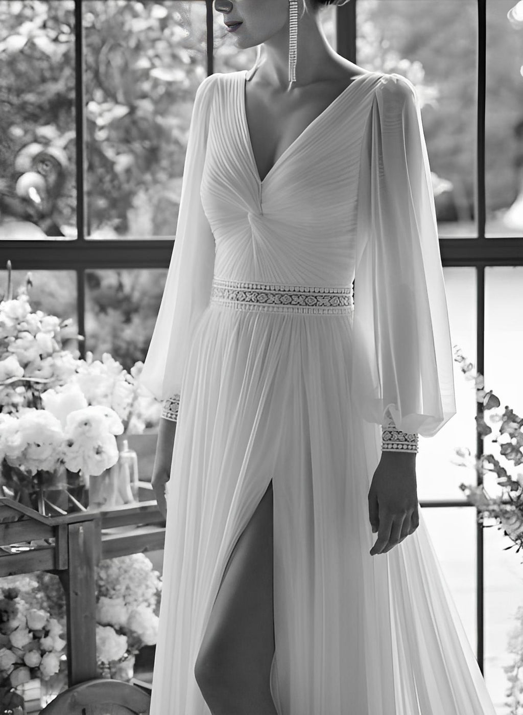Chiffon Wedding Dresses Chic A-line V-Neck Long Sleeves Court Train