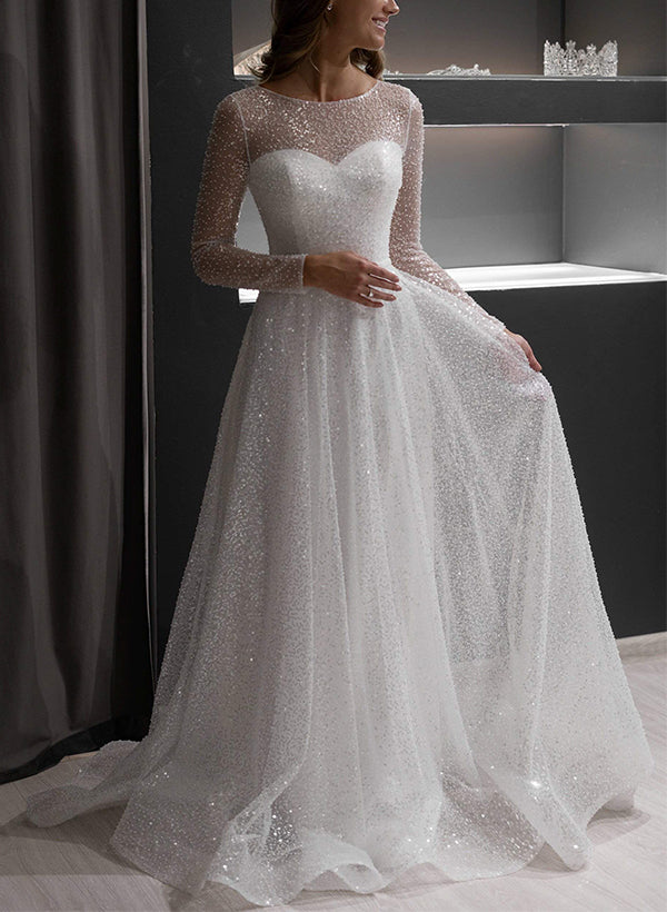 Illusion Neck Long Sleeves Sweep Train Sequined Wedding Dresses