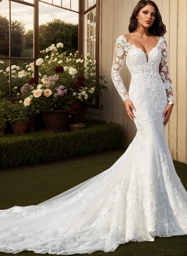 Mermaid Fitted V-Neck Long Sleeves Sweep Train Lace Wedding Dresses