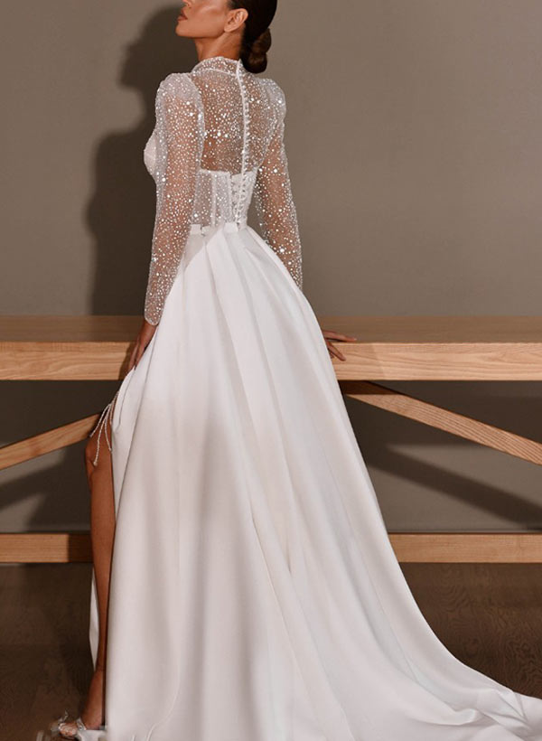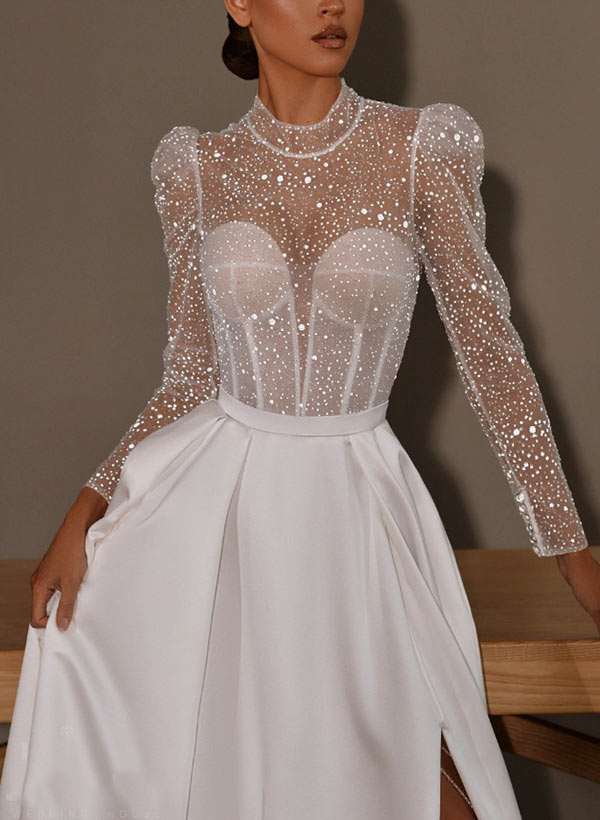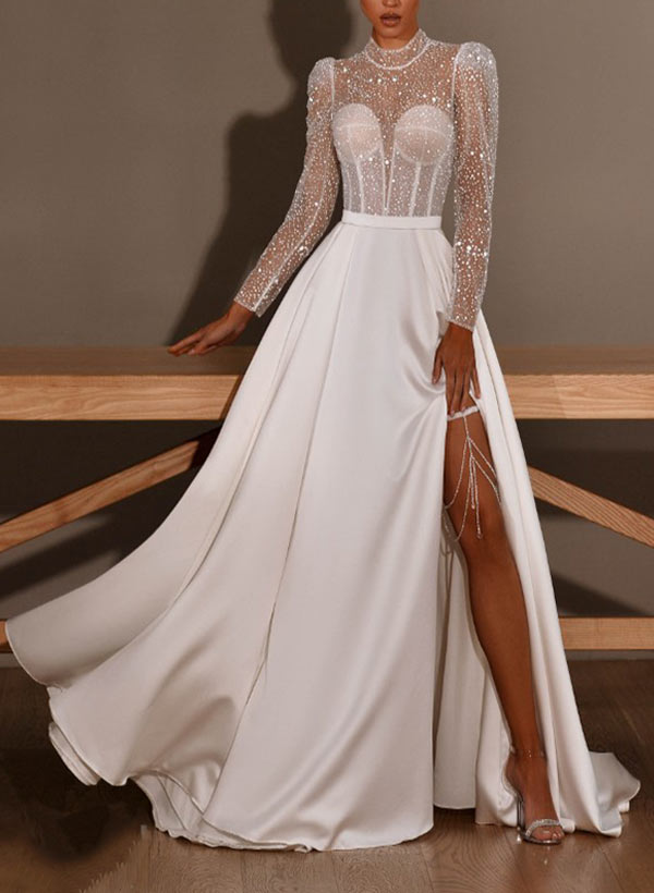 Sparkling High Neck Long Sleeves Sweep Train Satin Sequined Wedding Dresses Front Split