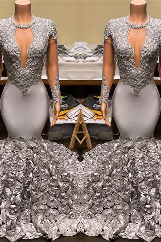 Silver Party Dress Fit and Flare Floral Prom Dresses Lace Appliques Real Shooting Formal Dresses