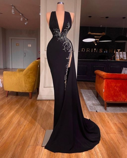 Black V-Neck Mermaid Prom Dress with Split and Beadings