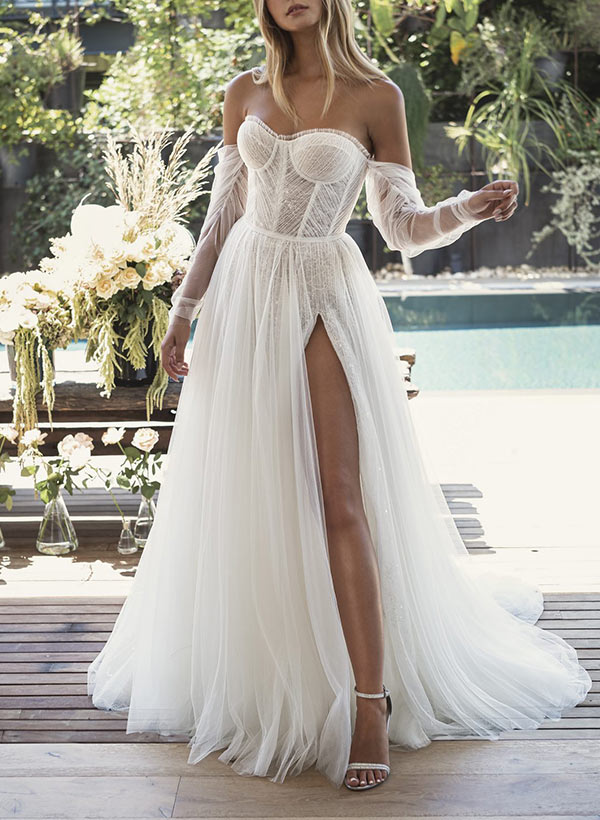 Chic A-line Elegant Sweetheart Sweep Train Tulle Wedding Dress Split Front