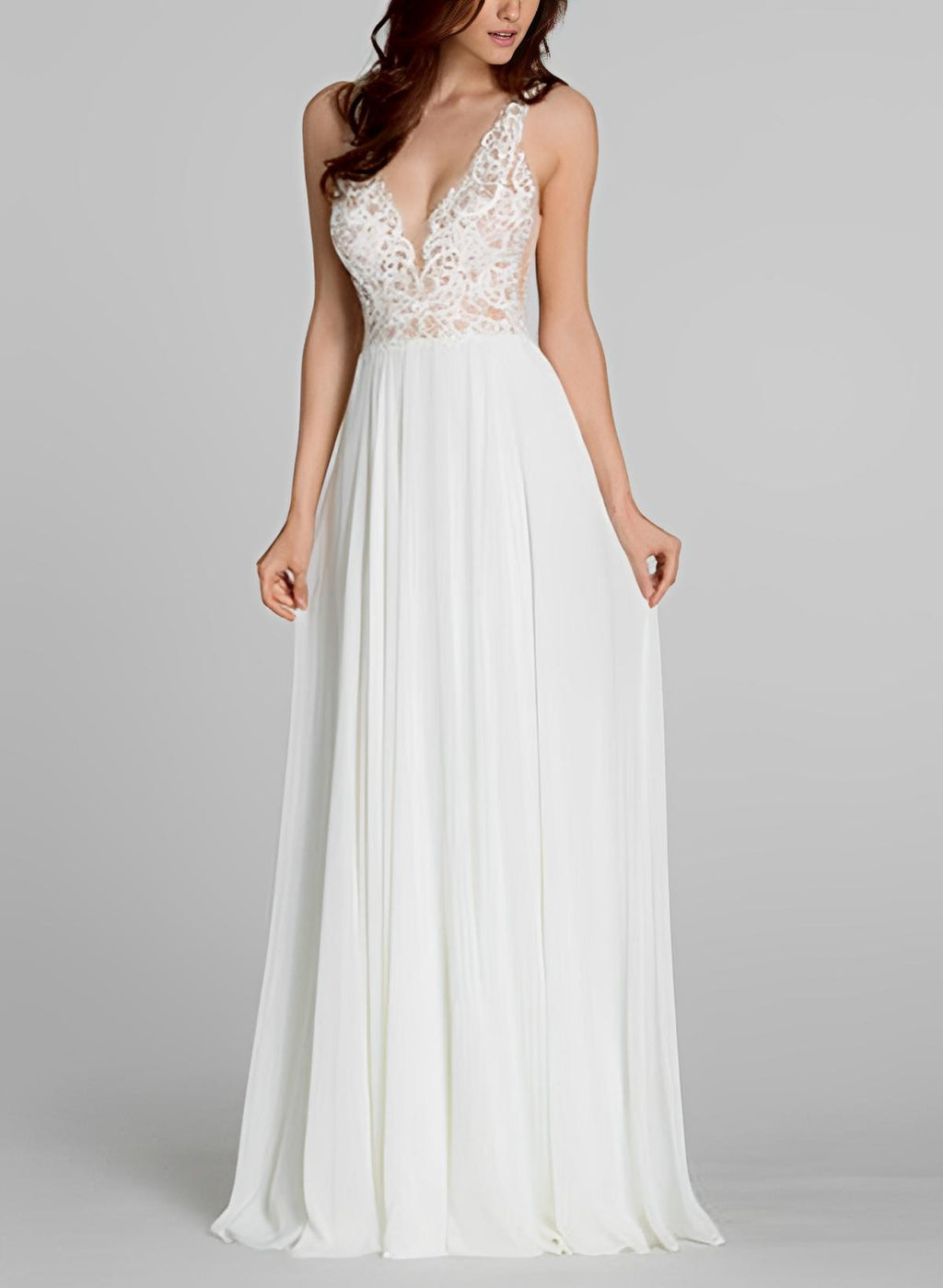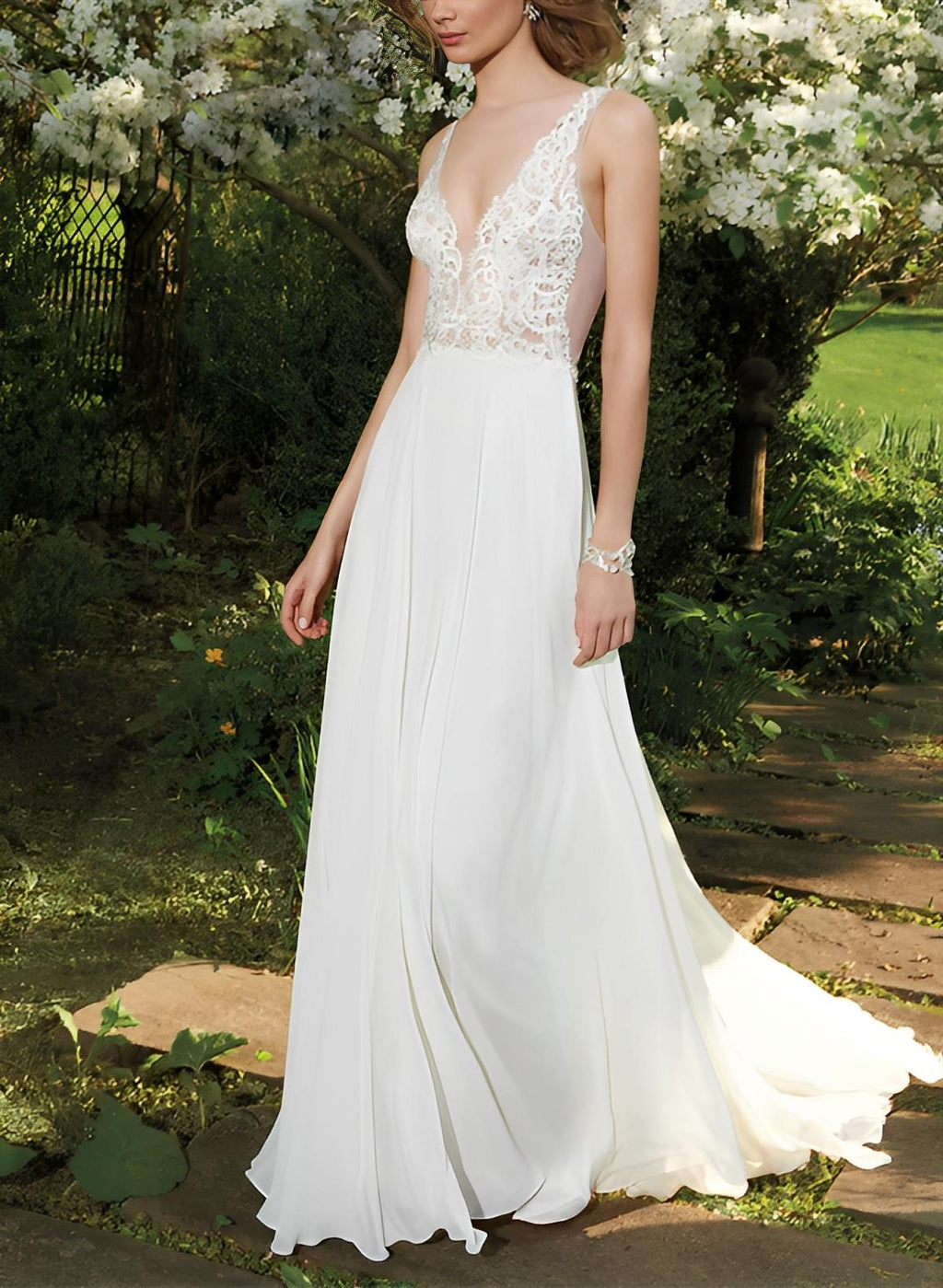 Chic A-line V-Neck Boho Garden Chiffon Wedding Dresses Appliques Lace