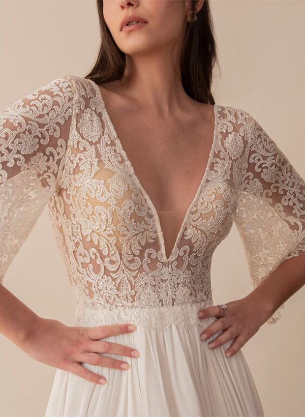 Chic A-line V-neck Sheer Lace Sleeves Tulle Wedding Dresses Appliques Lace
