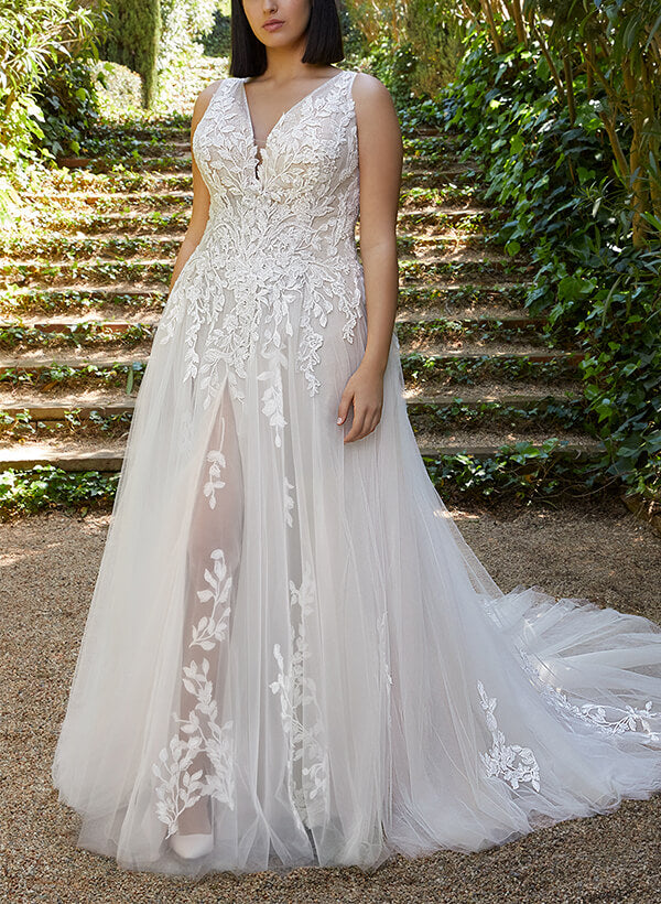 Chic A-line V-Neck Sleeveless Court Train Tulle Wedding Dresses Appliques Lace