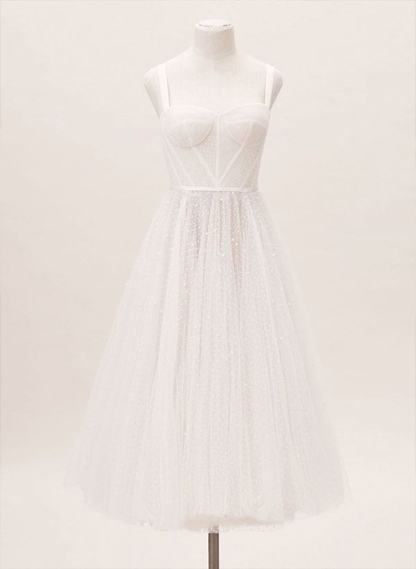 Elegant Sweetheart Sleeveless Tulle Tea-Length Wedding Dresses Pleated Chic A-line