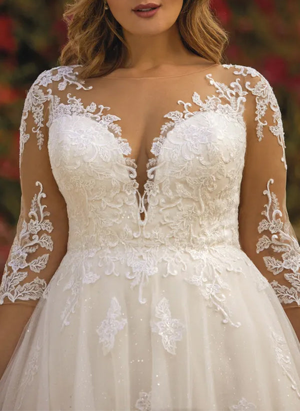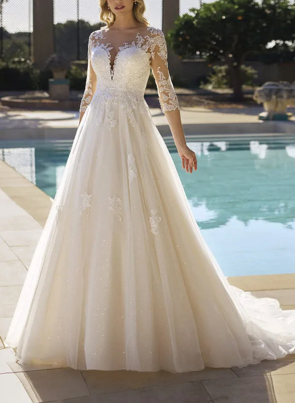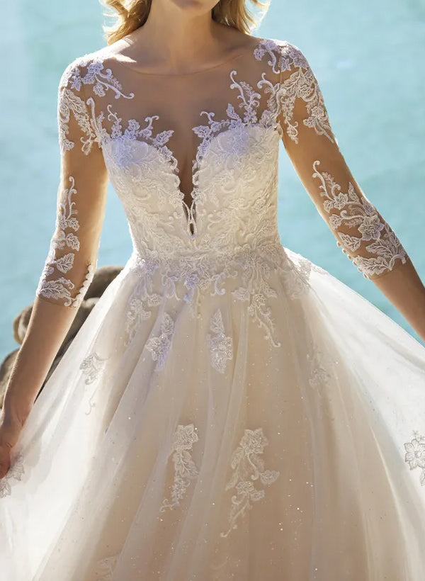 Illusion Neck Chic A-line Wedding Dresses Sequins Lace Tulle 3 4 Sleeves