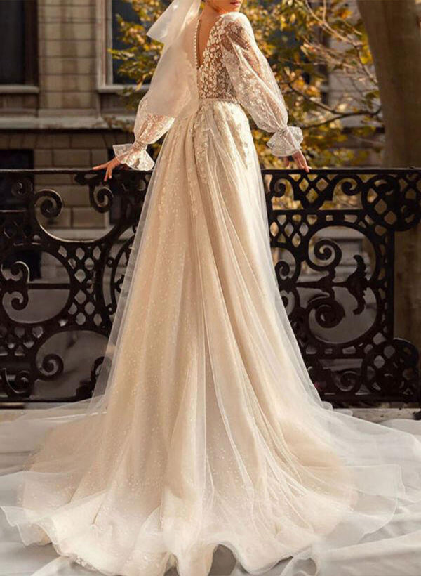 Lace V Neck Tulle Lace Sweep Train Wedding Dresses Lace