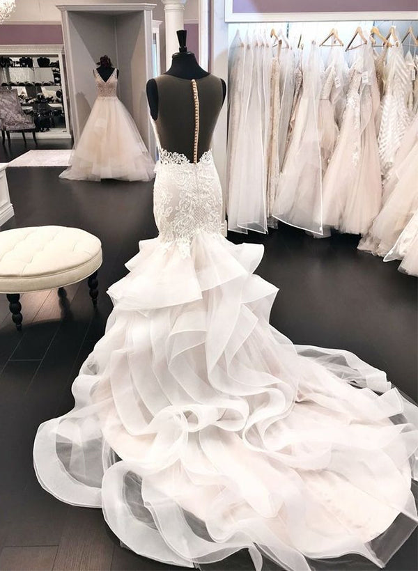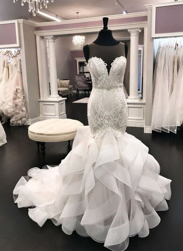 Luxury Lace Tulle Wedding Dresses Cascading Ruffles Illusion Neck Mermaid Fitted