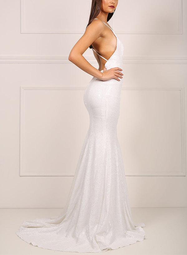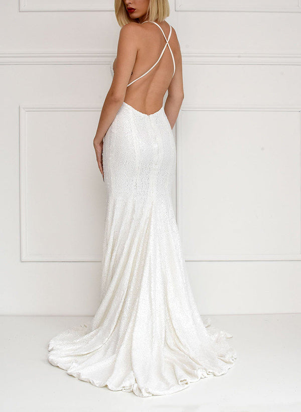 Sequined Mermaid Fitted V-Neck Sleeveless Wedding Dresses Open Back