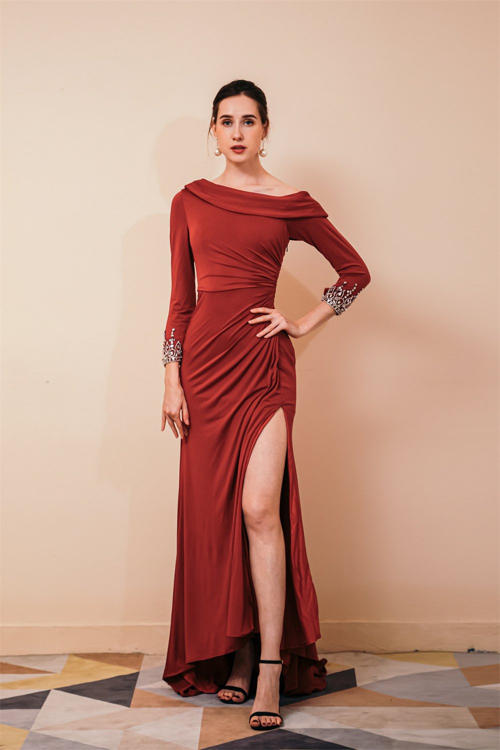 Burgundy Evening Gowns Long Sleevess Jersey Unique neckline Evening Party Gowns