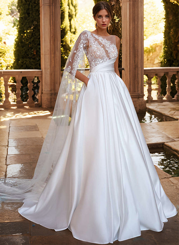 Chic A-line Sweep Train Satin Wedding Dresses Appliques Lace