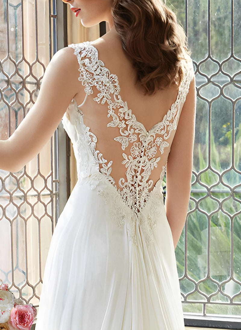 Chic A-line V-Neck Sleeveless Lace Court Train Wedding Dress Lace