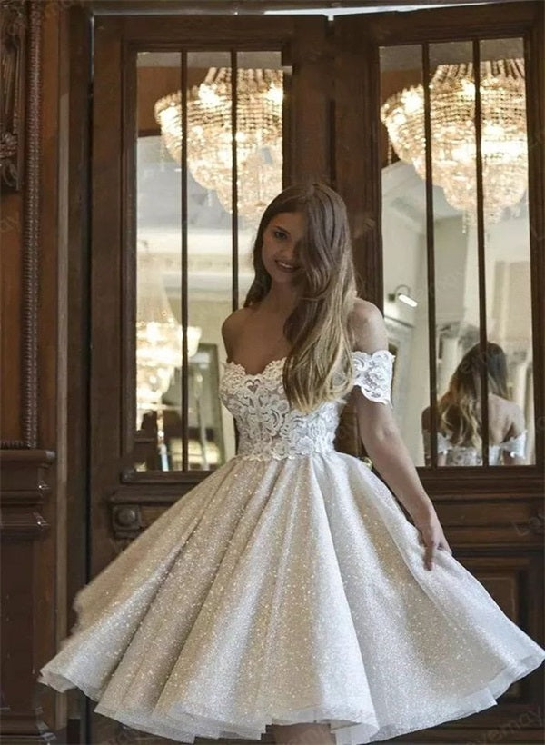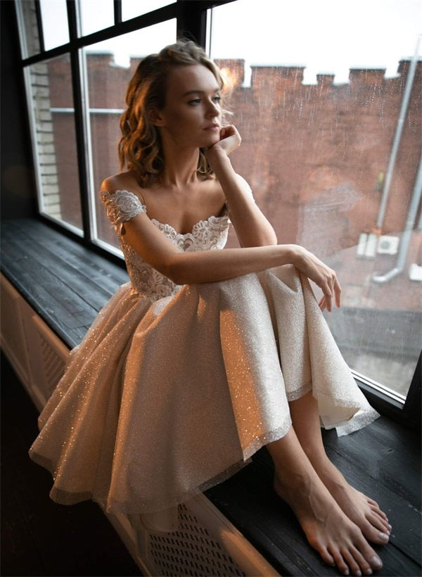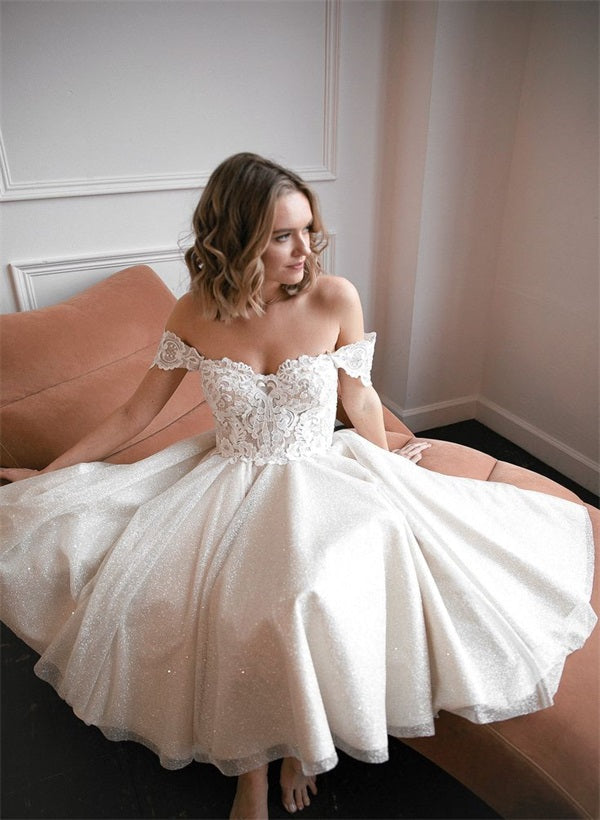 Off-The-Shoulder Lace Sequined Tea-Length Wedding Dress