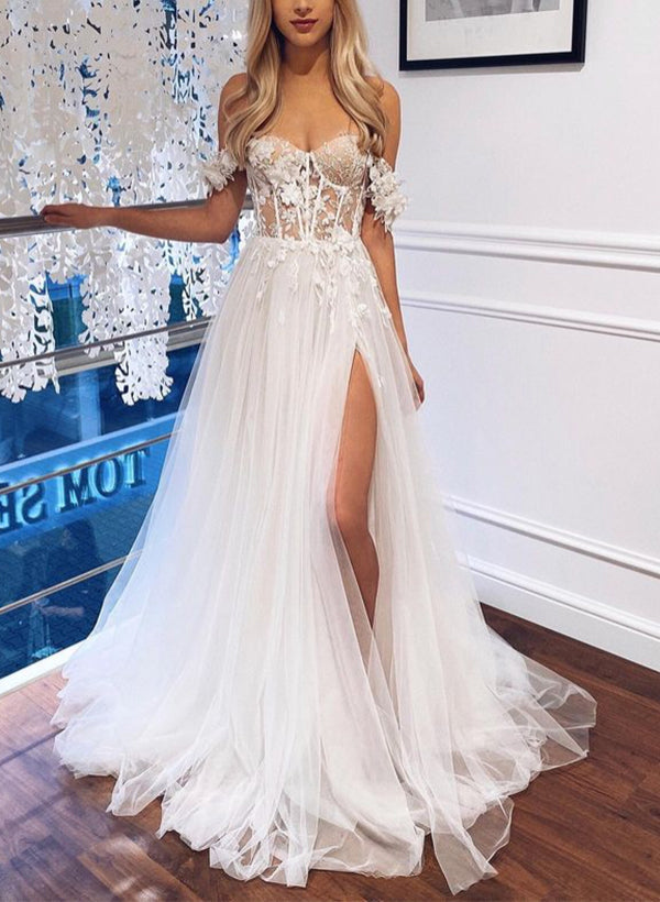 Off-The-Shoulder Tulle Wedding Dresses Split Front Appliques Lace