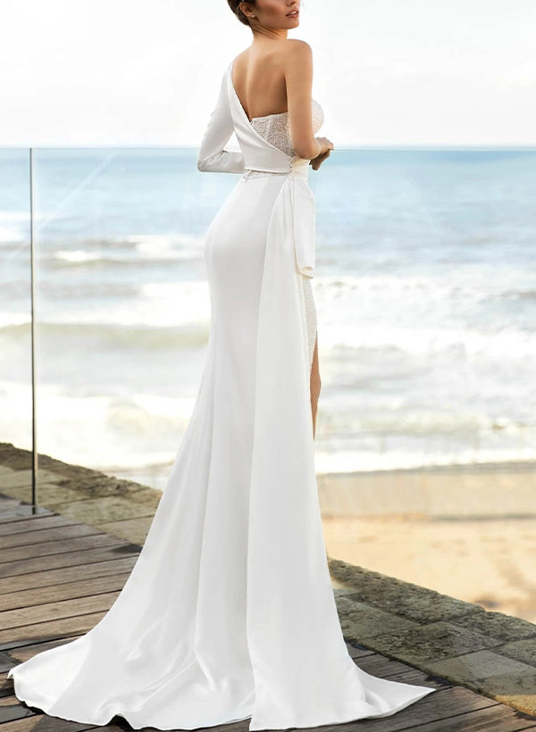One-Shoulder Long Sleeves Wedding Dress Split Front