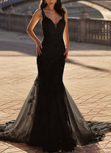 Trumpet Mermaid Fitted V Neck Sleeveless Tulle Wedding Dresses Appliques Lace
