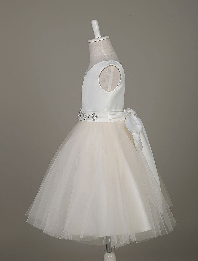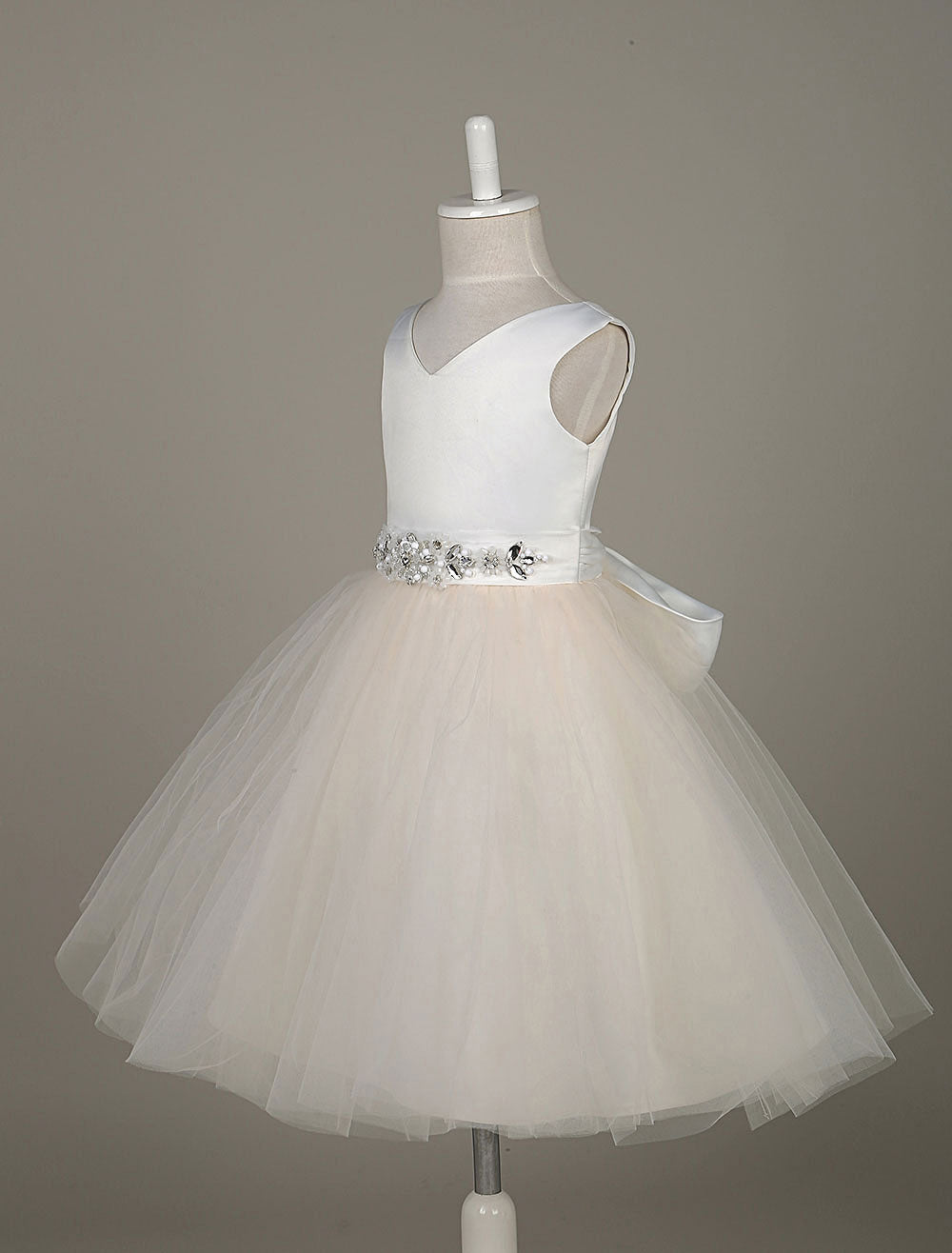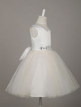 Tulle Satin V Neck Tutu Dress Ivory Beading Waist Sleeveless A-line Dinner Dress With Sash