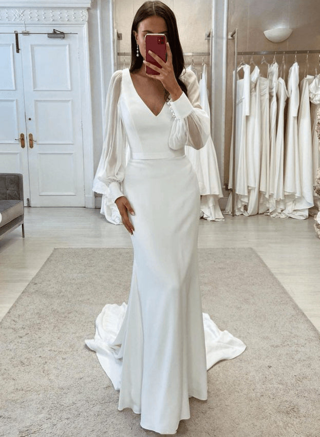 V-Neck Mermaid Fitted Wedding Dresses Elegant Long Sleeves