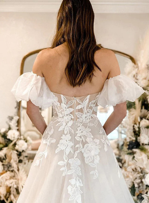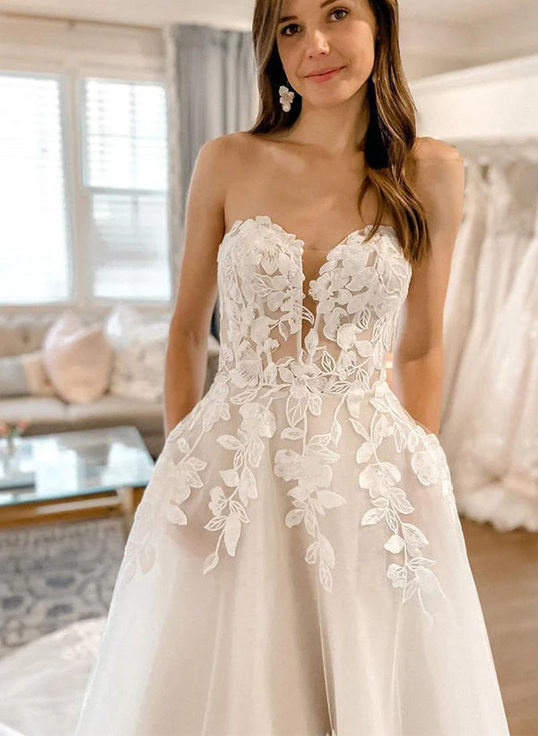 Strapless Chic A-line Wedding Dress Elegant Sweetheart Neckline Tulle Skirt Featuring Appliques Lace