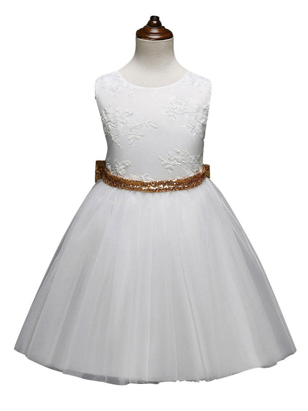 White Jewel Neck Sleeveless Sash Lace Formal Kids Pageant flower girl dresses