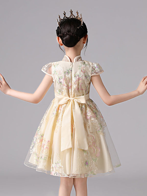 Champagne Designed Neckline Short Sleeves Bows Short Kids Party Dresses